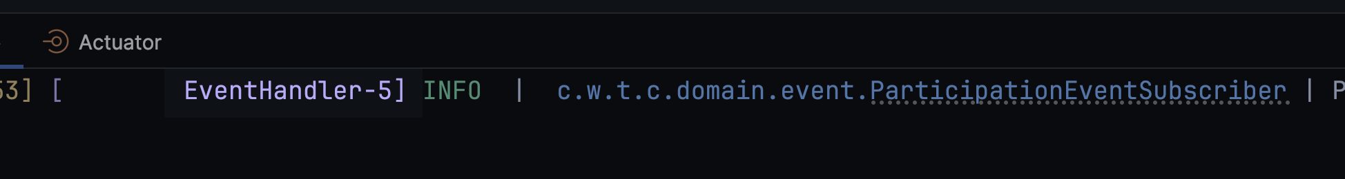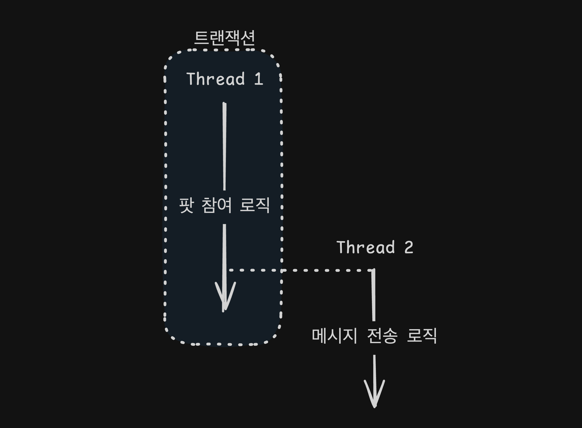 위의 코드를 실행하면 팟 참여 로직은 트랜잭션 내에서 실행되고 메시지 전송 로직은 트랜잭션 외부에서 다른 스레드에 의해 실행됩니다. 팟 참여 로직에서 메시지 전송 로직에 대한 관심사를 최대한 분리하고 메시지 전송 로직에 관여하지 않도록 했기 때문에 당연하고 의도한 동작입니다.