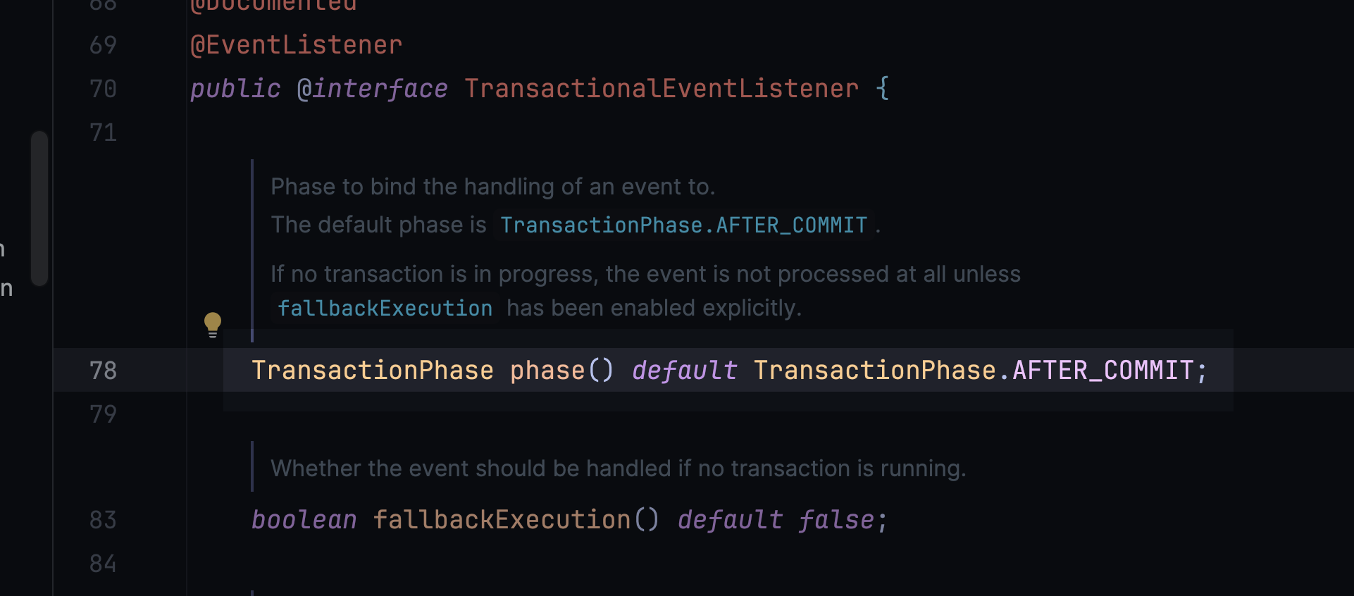 BEFORE_COMMIT- 트랜잭션이 커밋되기 전에 이벤트 처리AFTER_COMMIT(default) - 트랜잭션이 커밋되어 완료된 후 이벤트 처리AFTER_ROLLBACK- 트랜잭션이 롤백된 후 이벤트 처리AFTER_COMPLETION- 트랜잭션이 완료된 후(커밋 또는 롤백) 이벤트 처리