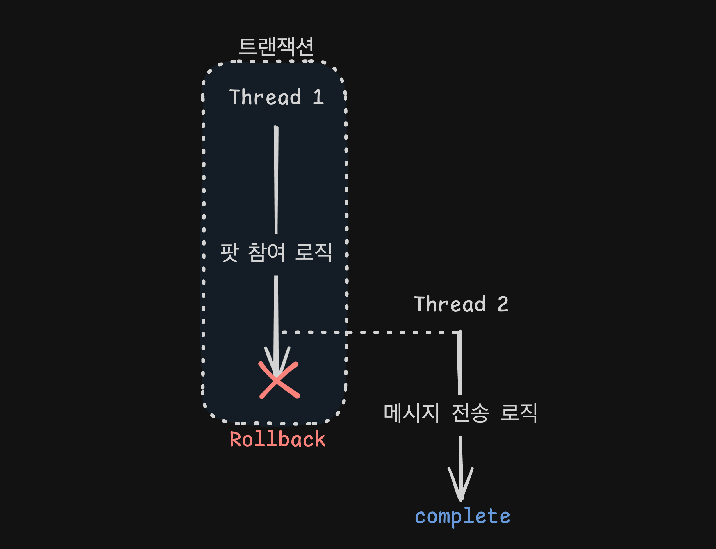 하지만 트랜잭션이 Commit 되지 않고 예기치 못한 문제가 발생해 트랜잭션이 Rollback 되어 팟 참여 로직이 완료되지 않은 경우에도 메시지 전송 로직은 정상적으로 완료됩니다. 이 경우, 사용자가 팟에 참여되지 않았지만 참여 메시지는 전송되는 문제가 생길 수 있습니다.